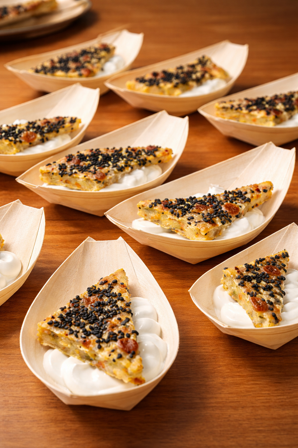 Fırınlanmış karnabahar, taze otlar ve baharatlarla hazırlanan hafif mücver dilimleri, kremamsı isli yoğurt eşliğinde sunulur. Üzerine serpiştirilen siyah susam, lokmaya hem çıtır bir dokunuş hem de aromatik bir derinlik katar.